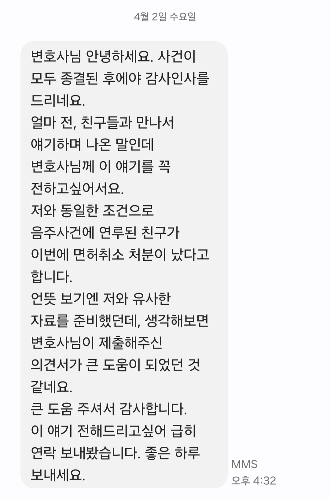 적절한 대응의 결과는 구제와 선처였고요. 덧붙여 오늘 이런 문자까지 받게 되었는데 이렇게 감사를 표하시니 의뢰인분들을 진정성 없이 대할 수가 있나요.